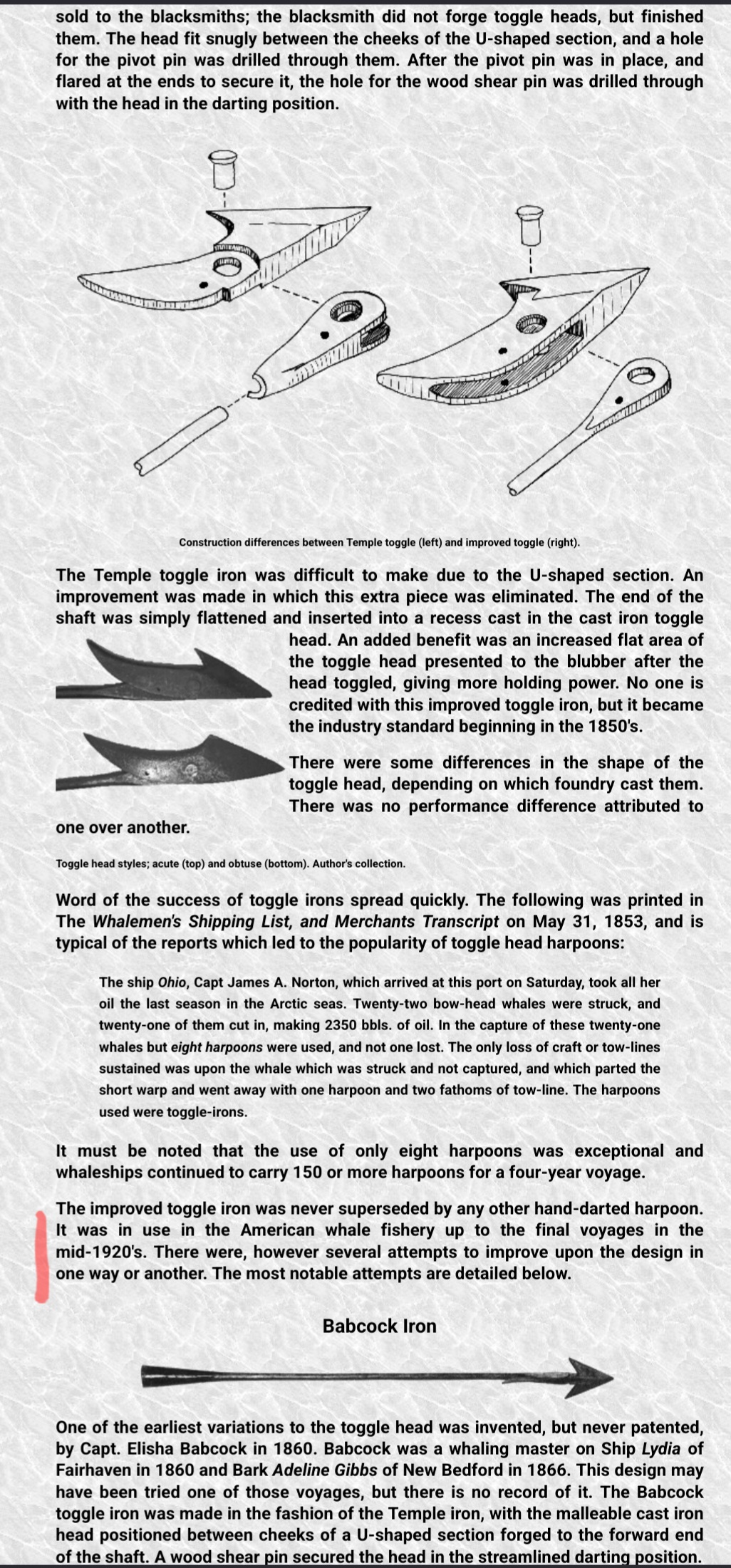 Deze harpoen werd in 1848 ontwikkeld door de Afrikaans-Amerikaanse smid Lewis Temple uit New Bedford, Massachusetts. Hij baseerde zijn ontwerp op technieken van Inuit-jagers en perfectioneerde het zo doeltreffend dat het vrijwel onveranderd in gebruik bleef tot het einde van de handharpoenjacht na 1920.